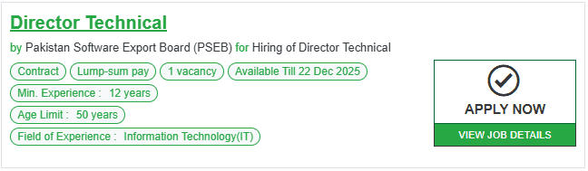 پاکستان سافٹ ویئر ایکسپورٹ بورڈ اپنے عروج پر پہنچنے کے لیے آپ کی رہنمائی چاہتا ہے۔ کیا آپ ٹیکنالوجی کے میدان میں ایک ایسے رہنما ہیں، جو نہ صرف گہری تکنیکی مہارت رکھتے ہیں بلکہ حکمت عملی سے ملک کی ڈیجیٹل برآمدات کو نئی بلندیوں پر لے جا سکتے ہیں؟ اگر آپ کا جواب ہاں ہے، تو ڈائریکٹر ٹیکنیکل کے اس تاریخی موقع پر آپ کا منتظر ہے۔ یہ صرف ایک عہدہ نہیں، بلکہ پاکستان کے آئی ٹی مستقبل کو تشکیل دینے اور اسے عالمی نقشے پر روشن کرنے کا ایک موقع ہے۔